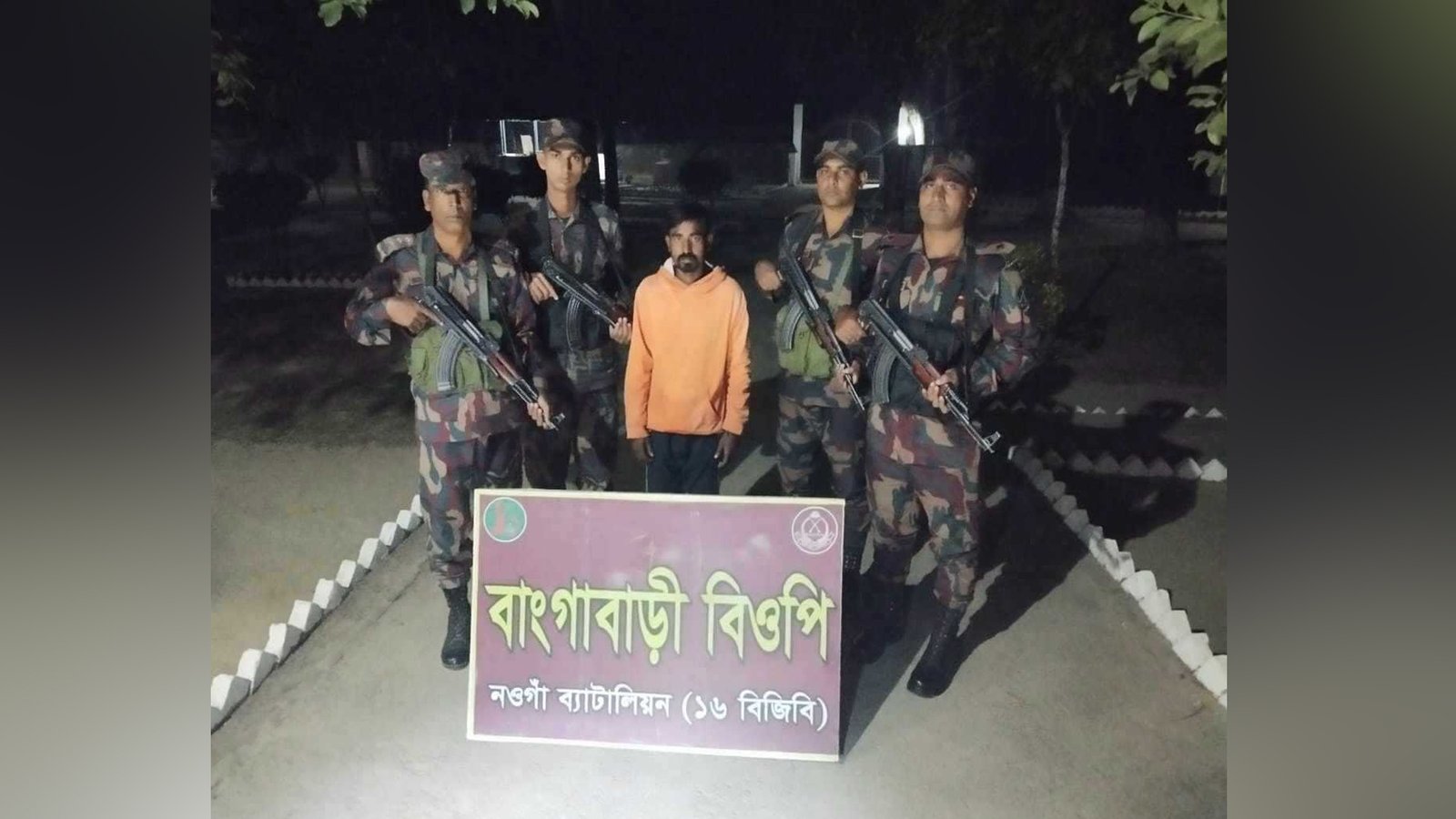 মঙ্গলবার সকাল ৯টায় গোমস্তাপুর উপজেলার বাংগাবাড়ি সীমান্ত এলাকা থেকে তাকে আটক করে নওগাঁ ব্যাটালিয়ন ১৬ বিজিবি। এ সময় তার কাছে থেকে ভারতীয় রুপি ও বাংলাদেশি টাকা উদ্ধার করা হয়। বুধবার (৪ ডিসেম্বর) সকালে বিষয়টি নিশ্চিত করেছেন নওগাঁ ব্যাটালিয়নের (১৬ বিজিবি) অধিনায়ক লেফটেন্যান্ট কর্নেল মুহাম্মদ সাদিকুর রহমান।